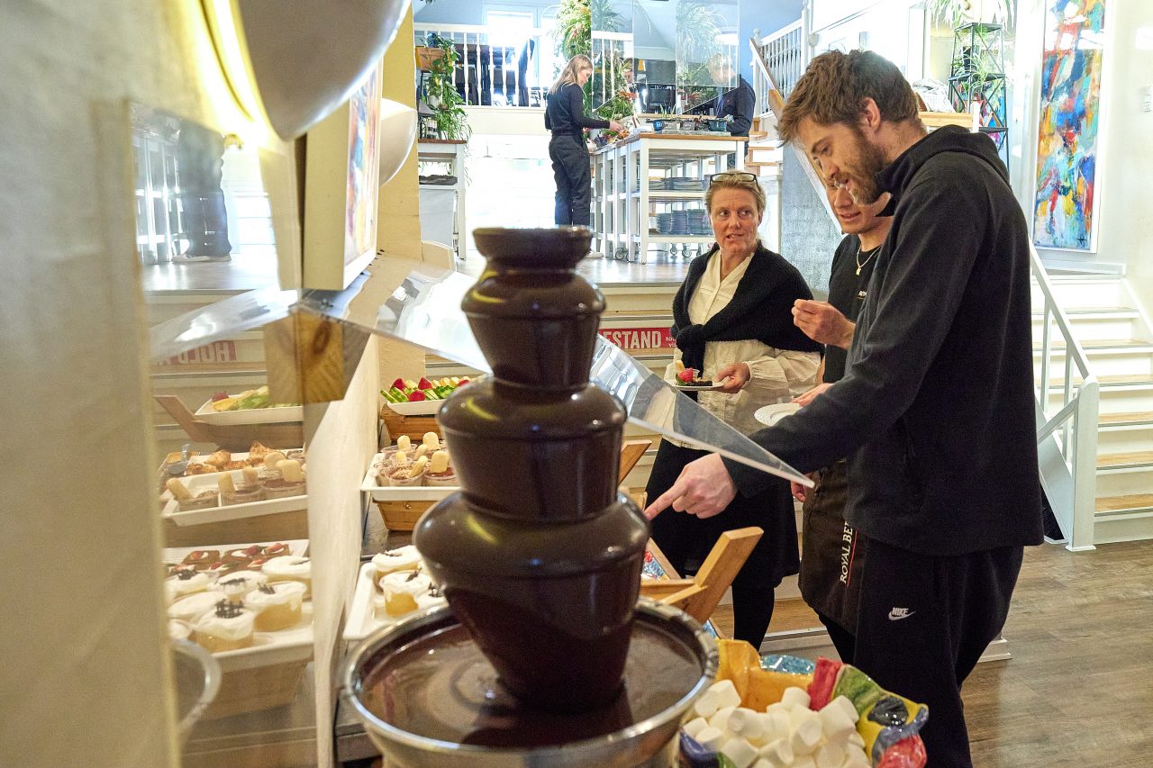 Dessertbordet består af en lækker chokoladefondue, udvalgte kager og flødeboller.
